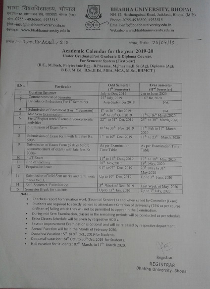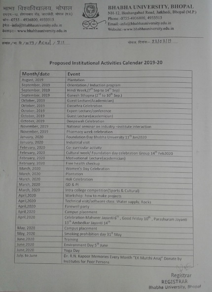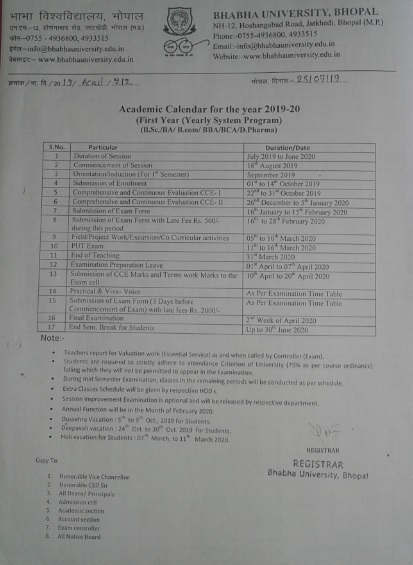 Academic calendar for the year 2019-20, First Year (Yearly System Program), (B.Sc/BA/B.Com/BBA/BCA/D.Pharm)