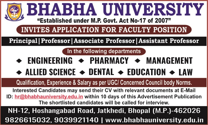 Applications are invited for Faculty posts (Principal/Professor/Associate Professor/Assistant Professor) in Bhabha University. Dated 10.07.2024 (New)
