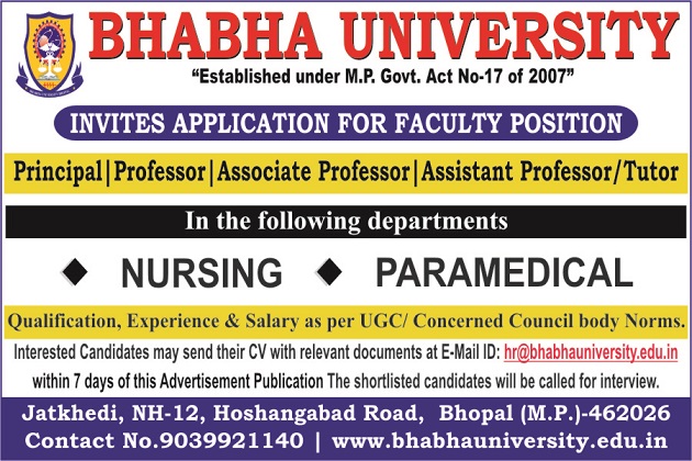 Bhabha University has invited applications for the post of Nursing & Paramedical Faculty position. Dated 9.7.2024 (New)